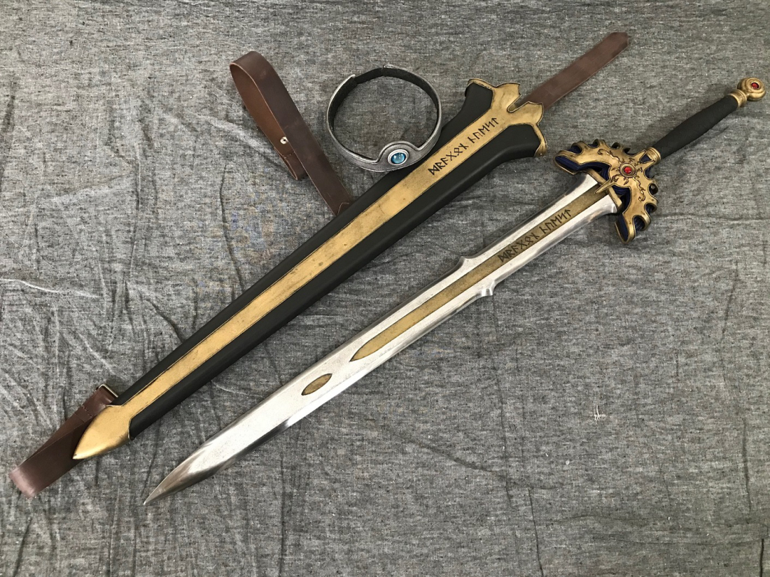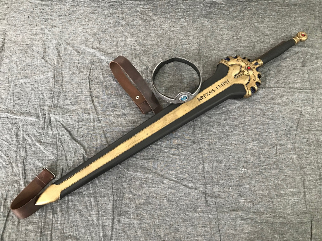 剣・挙式用金属モデル+鞘+冠No.124(107番刀身改、ツバ赤凹模様、グリップ赤黒、段差暗い赤金、専用台座製作中)