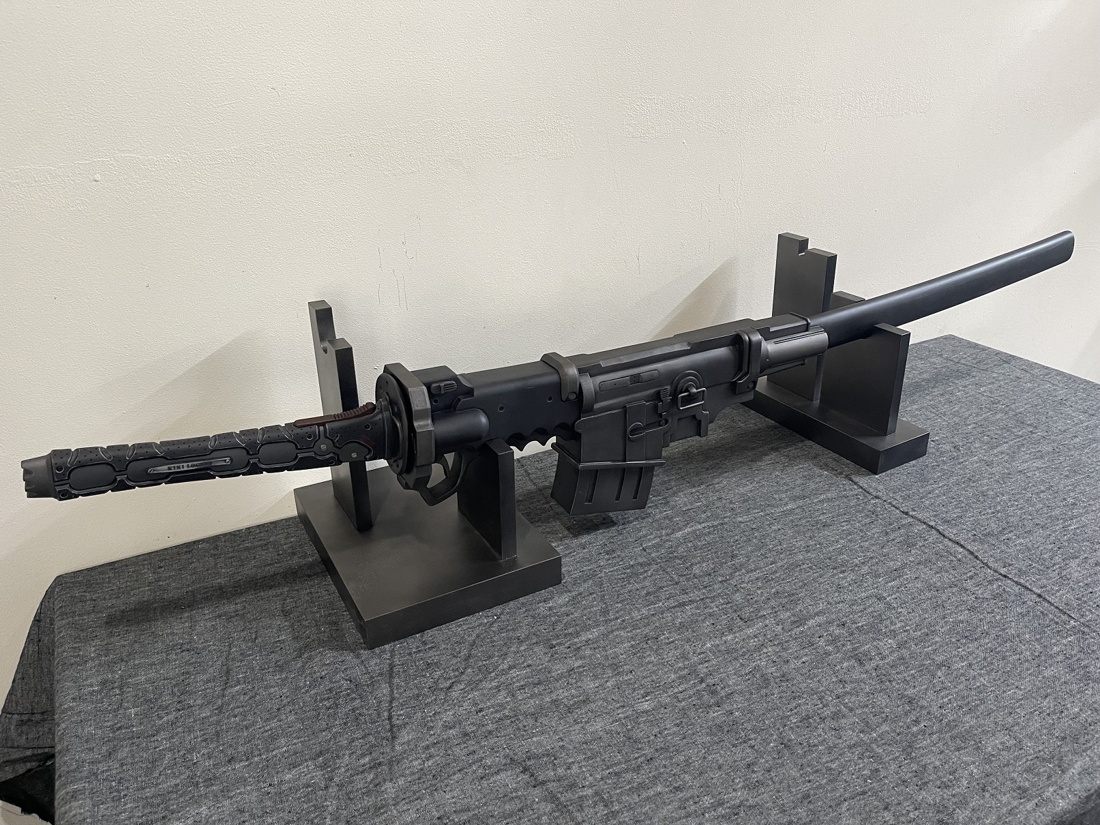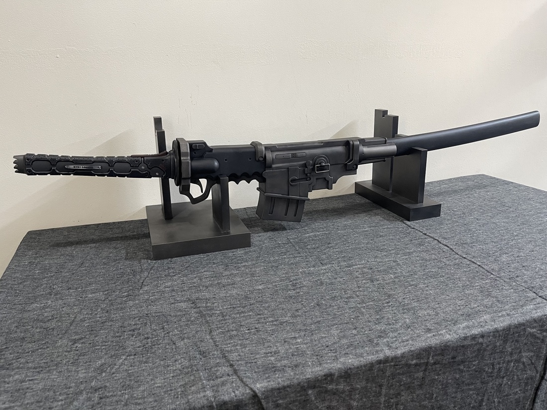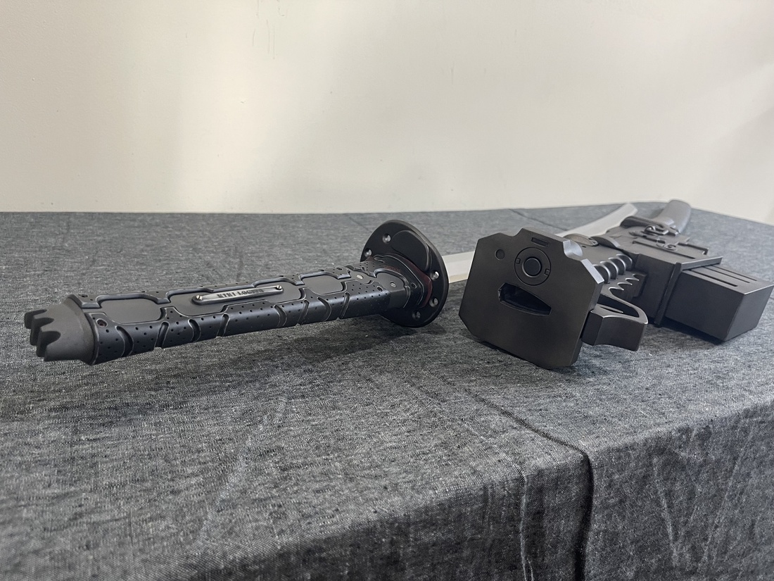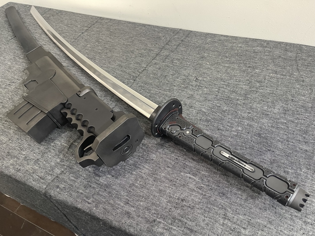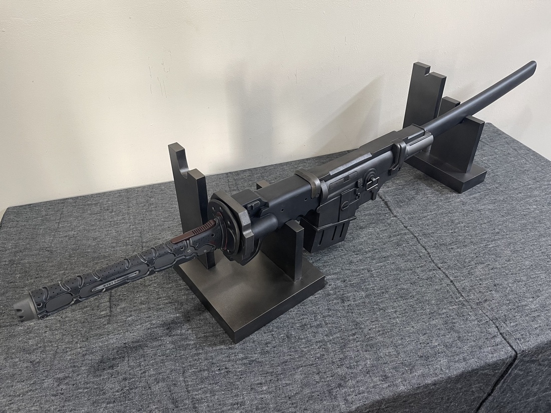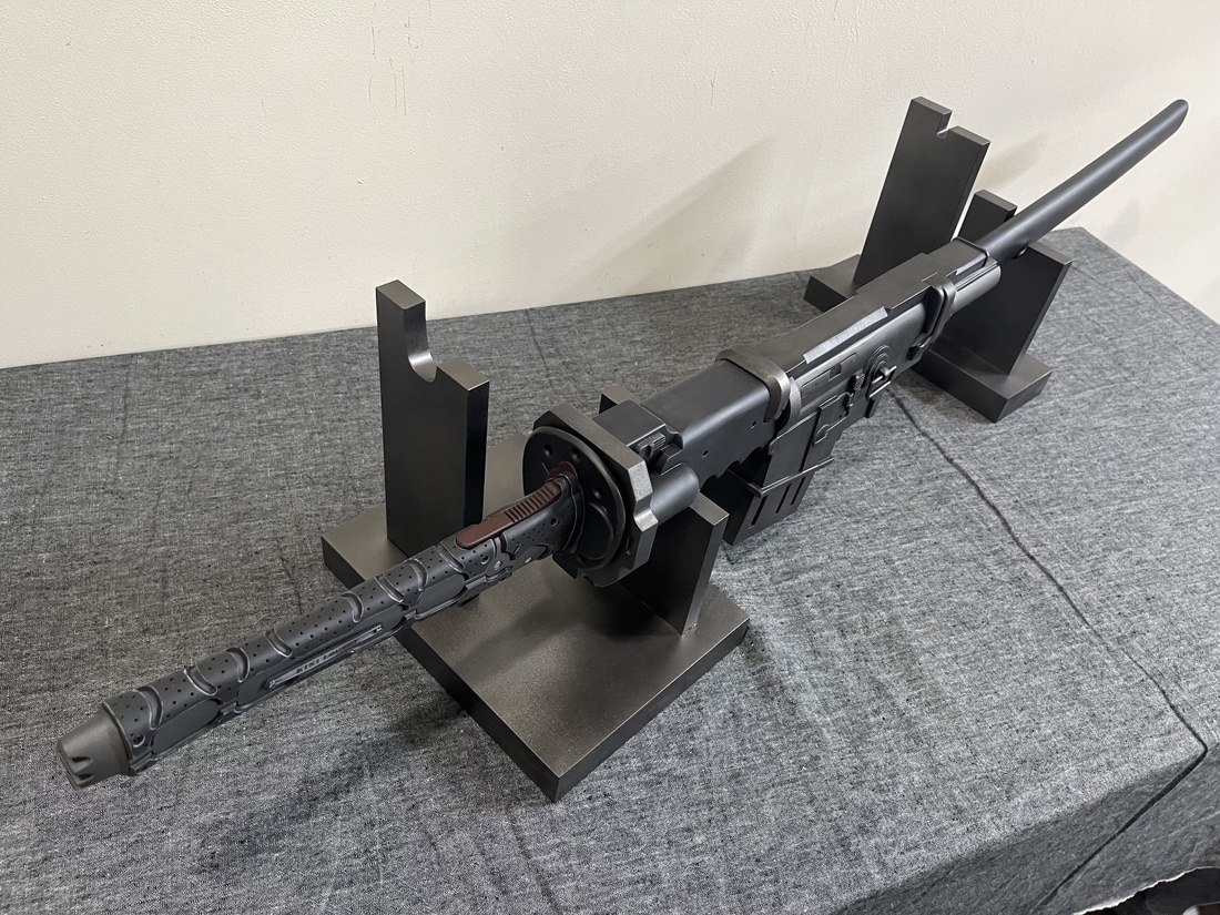 今回のモデルは ・赤いパーツは赤黒く ・使用感あり ・全体的に落ち着いた色合い ・刀身は塗装せず ・プレート文字を変更 上記のような内容でご依頼いただきました。 おそらく設定上は素材の違う各パーツごとに色味が違うのですが、 全体的な渋みを重視して色合いと質感を調整しております。 使い込みによる擦れ、凹み、色褪せ等もバランスを確認しながら表現しました。
