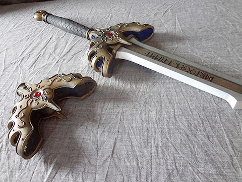 品名:【剣・モデル+着脱ギミック+交換パーツNo.95】 武具庫92番モデルに近いモデルを非金属verとして製作いたしました。 刀身とグリップの芯材に金属を使用している為、総重量は1750gもあります。 ~予備パーツ一覧~ ・段差パーツ青/段差パーツ金 ・模様多めのツバ/模様少なめのツバ ・刻印入りグリップ上リング/無地グリップ上リング ※刀身根元の縁取りは省略しました