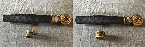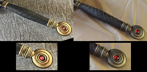 グリップ上下のリングに某EDより”そして伝説がはじまった”を英訳しルーン文字に変換して刻印しました。 リング径に合わせて文字数/文字間隔のバランスを考慮して配置し、文字のはじめと終わりに間をあけました。